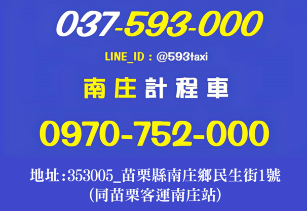 南庄計程車位於南庄老街內(民生街1號) 是服務於南庄在地的計程車業者 地址同苗栗客運_南庄站(1F)乘客等候區 有計程車招呼站,可於現場等候搭乘 2F樓梯隔壁有廁所,為現場搭乘的旅客提供服務 1F樓轉角隔壁有餐廳,也提供旅客用餐上的問題 現場也有免費的Wifi,隔壁還有雜貨店及7-11 是真正『在地服務』的南庄計程車 因為是在地,所以『市區短程』也有服務 而非有跑南庄對外行程的業者(不是跨區過來) 在地服務!路況熟悉!價格合理!經驗豐富! 提供安全有保障且價格合理的載客服務 然而!!進入網頁的朋友!應該最想知道的事 就是行程路線是否有提供服務?價格費用多少? 那麼以下將會提供價目表給各位參考 會針對 【車站.高鐵.民宿.景點.露營區.登山接駁.包車】 價目表上未提及的行程,可於線上或電話諮詢 電話:0970-752-000(台灣大哥大) 手機LINE帳號同電話(搜尋電話即可) 也可以加入『@593taxi』593網路叫車聯盟 官方帳號多人聯管,回覆效率會比較快 也可撥打市話037-593-000來替您服務 |